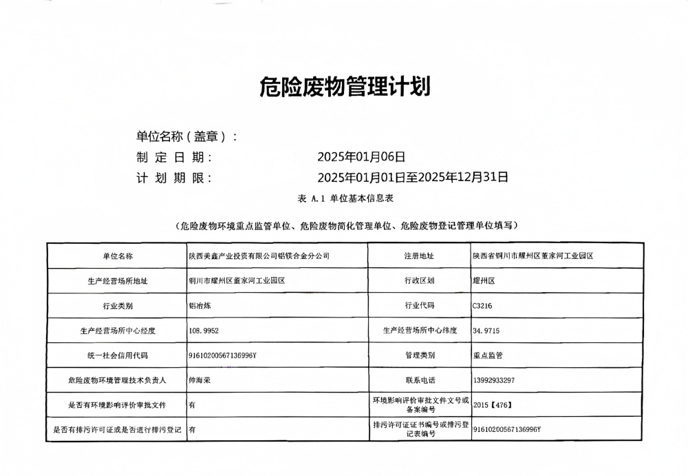 2025年危險(xiǎn)廢物管理計(jì)劃(鋁鎂合金分公司)